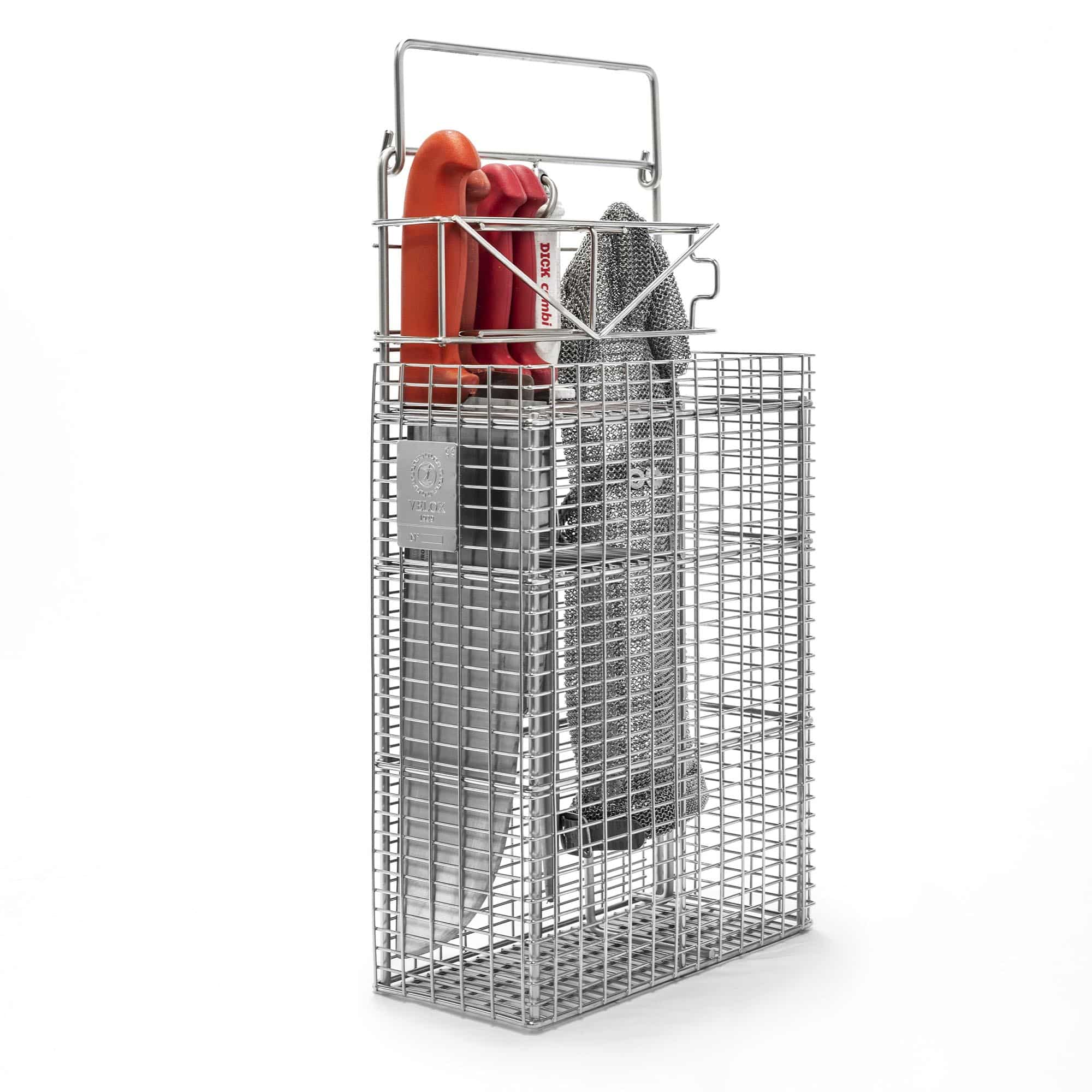 Il cesto porta coltelli CPC 5 G1 S è stato studiato per ottimizzare ogni fase del ciclo operativo legato all’uso dei coltelli, dalla lavorazione alla pulizia, disinfezione e conservazione sicura. La struttura compatta e resistente consente una gestione ordinata degli utensili da taglio, facilitandone il trasferimento diretto alle macchine per il trattamento igienico senza dispersioni o contaminazioni. Questo modello, come tutti quelli della Serie CPC, è progettato secondo i criteri previsti dalle normative HACCP e dalle regolamentazioni in materia di sicurezza alimentare, garantendo affidabilità, controllo e igiene. Il CPC 5 G1 S è perfettamente compatibile con le attrezzature Velox Barchitta per il lavaggio e la sanificazione professionale, offrendo una soluzione efficiente e tracciabile per la gestione degli strumenti in ambienti ad alta intensità produttiva.