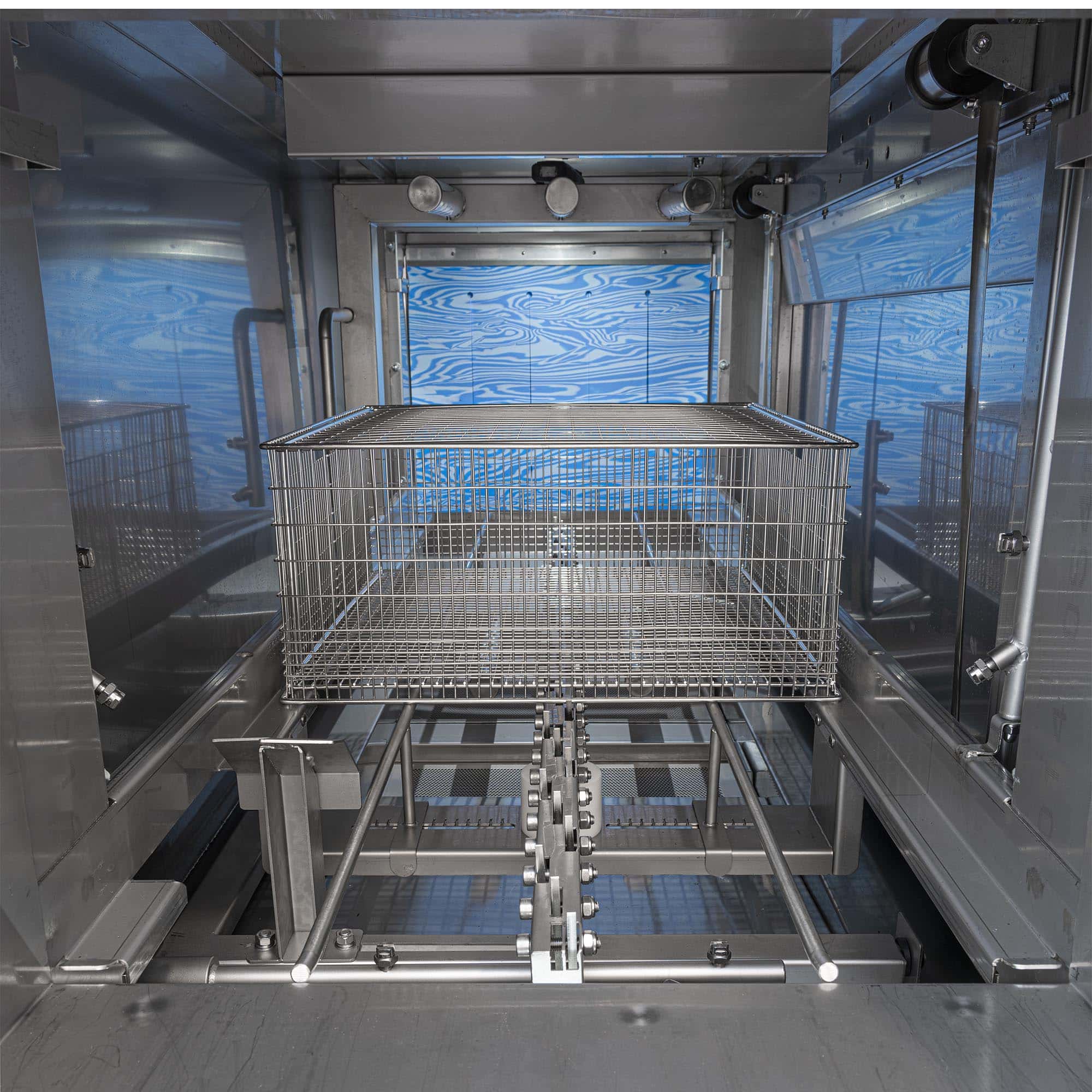 Costruita interamente in acciaio inox AISI 304, questa macchina per il lavaggio industriale si distingue per la sua struttura robusta e igienica. Le tubazioni, facilmente removibili e dotate di innesto rapido, rendono semplici e veloci tutte le operazioni di manutenzione e pulizia ordinaria. Il sistema di lavaggio e risciacquo distribuito su tre assi – superiore, inferiore e laterale – lavora in sinergia con un avanzamento a cesto trascinato a doppia velocità, offrendo così prestazioni elevate e una produttività ottimale. Un sensore elettromagnetico intelligente attiva il risciacquo esclusivamente quando il materiale è in prossimità degli ugelli, contribuendo in modo significativo alla riduzione dei consumi di acqua ed energia.